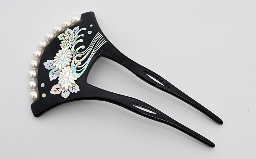 当店オリジナルの繊細な螺鈿ピン。菊に波を配し粋なイメージの一品です。一品ごとの手作りのため、色・柄・サイズ等が微妙に異なります。ご了承ください。